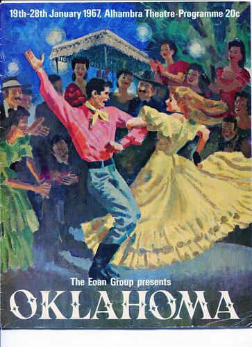 Souvenir programme from the EOAN Group's performance of 'Oklahoma'. Sylvia Booysen is listed under 'Singing Chorus'. Sylvia joined the EOAN Group in 1966 and performed in a variety of operas. She met her future husband, Lindsay Motherwell, through the Eoan Group's production of 'South Pacific'. The cover states that it was performed on 19th-28th January 1967, at the Alhambra Theatre. The programme cost 20c.