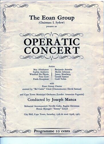 Souvenir programme from the EOAN Group's Operatic Concert, performed on 15th and 22nd April 1967 in City Hall, Cape Town, with the Eoan Group Chorus. Sylvia joined the EOAN Group in 1966 and performed in a variety of operas. She met her future husband, Lindsay Motherwell, through the Eoan Group's production of 'South Pacific'.