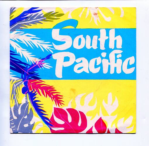 Record cover for a 45 RPM record. Cover matches the pattern on the cover of the programme for the production. On the back are the credits for the music, which states "Excerpts Sung by Eoan Group Stars. With Full Orchestra Conducted by Joseph S. Manca." SIDE ONE played "SOME ENCHANTED EVENING (Benjamin Arendse) and A COCKEYED OPTIMIST (Vera Gow)" SIDE TWO played "BALI HA'I (Sophia Andrews) and YOUNGER THAN SPRINGTIME (Martin Johnson)". It was recorded by FEATURE FILM SOUND (Pty.) Ltd.