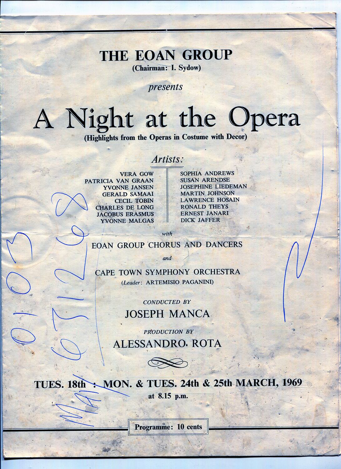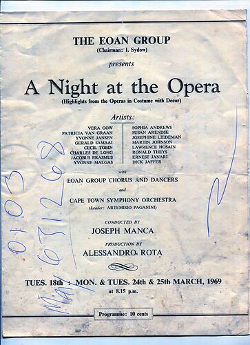 Souvenir programme for 'A Night at the Opera', presented by the Eoan Group. It was performed on the 18th, 24th and 25th of March 1969. Sixteen artists are listed, with 'Eoan Group chorus and dancers'. Sylvia joined the Eoan Group in 1966 and performed in a variety of operas in the chorus. She met her future husband, Lindsay Motherwell, through the Eoan Group's production of 'South Pacific'.