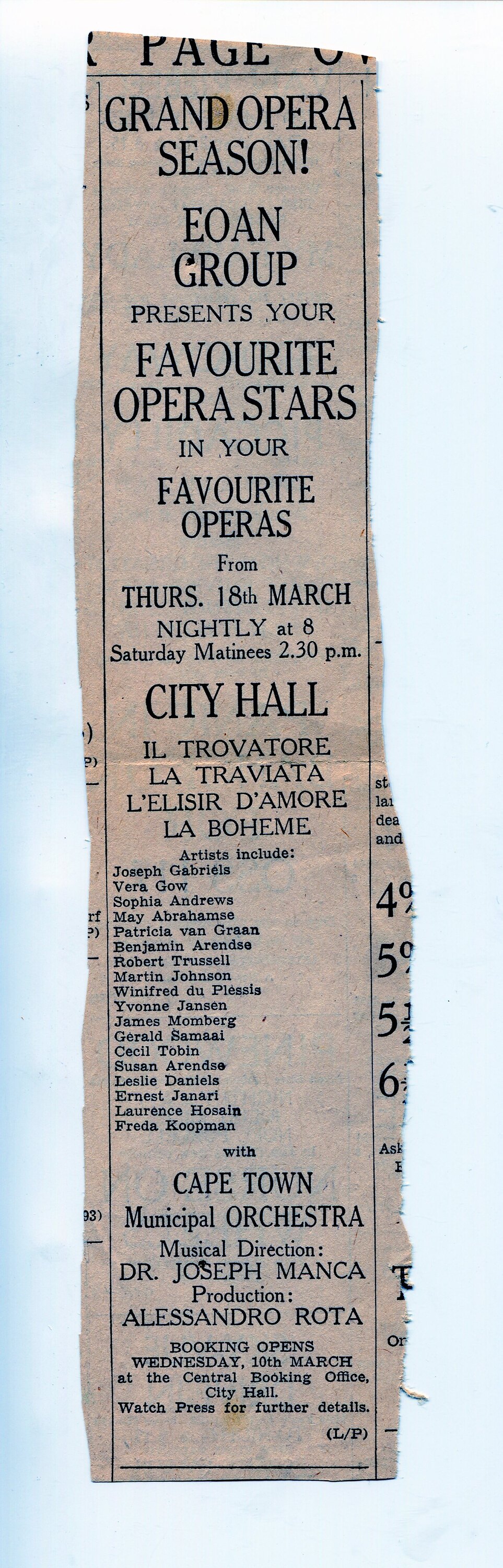 A newspaper clipping of an advertisement for the Grand Opera Season by the Eoan Group. It lists the four operas: 'Il Trovatore', 'La Traviata', 'L'Elisir D'Amore' and 'La Boheme'. It also lists a variety of artists included. It is unclear what year this is from, but possibly 1965. Sylvia Boyes joined the Eoan Group in 1966 and performed in a variety of operas in the chorus. She met her future husband, Lindsay Motherwell, through the Eoan Group's production of 'South Pacific'. Sylvia left South Africa in 1969 and migrated to Australia in 1970.