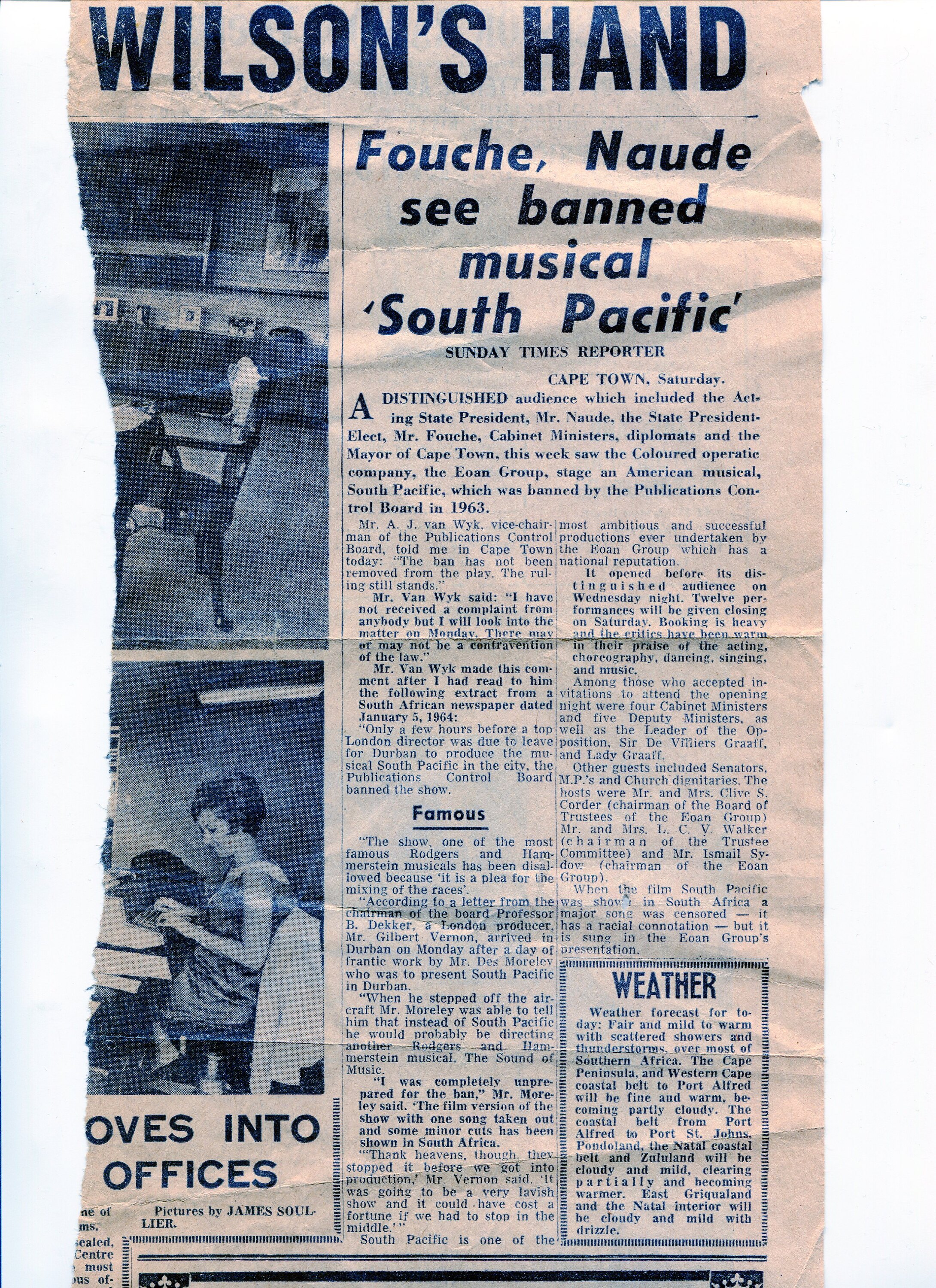 Newspaper clipping of an article titled 'Fouche, Naude see banned musical 'South Pacific'" published on 3 March 1968. It discusses the Acting State President, Mr Naude, the State President-Elect, Mr Fouche, Cabinet Ministers, diplomats and the Mayor of Cape Town attending the musical 'South Pacific'. It goes on to explain that the musical was banned in 1963 because 'it is a plea for the mixing of the races'. However, it was performed in 1968 despite the ban not being officially lifted and twelve performances were planned. Sylvia Boyes joined the Eoan Group in 1966 and performed in a variety of operas in the chorus. She met her future husband, Lindsay Motherwell, through the Eoan Group's production of 'South Pacific'. Sylvia left South Africa in 1969 and migrated to Australia in 1970.