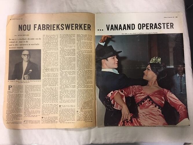 Three pages from STER magazine, dated 17 September 1965. On page 22 is an article about Joseph Manca and the Eoan Group in Afrikaans, and on page 23 is a full-page photo of two principal actors in the opera 'La Traviata'. The title, which runs across pages 22 and 23 is 'Nou Fabriekswerker ... Vanaand Operaster', which translates to 'Now Factory Worker, Tonight Opera Star'. On page 24-25 is a double-page spread of photos from the Eoan Group's performance of the opera 'La Traviata', with captions and the rest of the article. Sylvia Boyes first auditioned for the Eoan Group in 1958-59, and was part of the Eoan Group chorus from 1966.