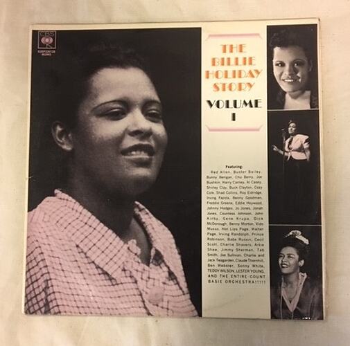 A Billie Holiday album titled 'The Billie Holiday Story Volume I'. It consists of two vinyl records in their original plastic sleeves within the album cover. It was recorded in the USA and distributed in 1972. Lindsay and Sylvia Motherwell both enjoyed a variety of music, from jazz to musicals.