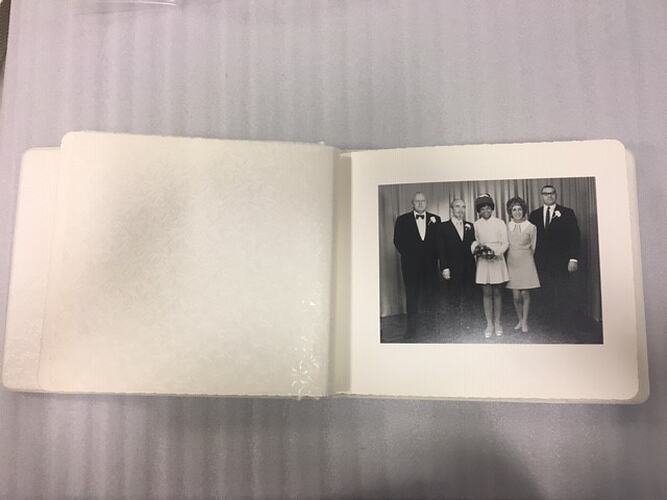 Black and white photograph of Sylvia and Lindsay Motherwell with their wedding party at their wedding in London on 29 September 1969. The party consists of two groomsmen and a woman. This is one of 11 photos in their wedding album.
