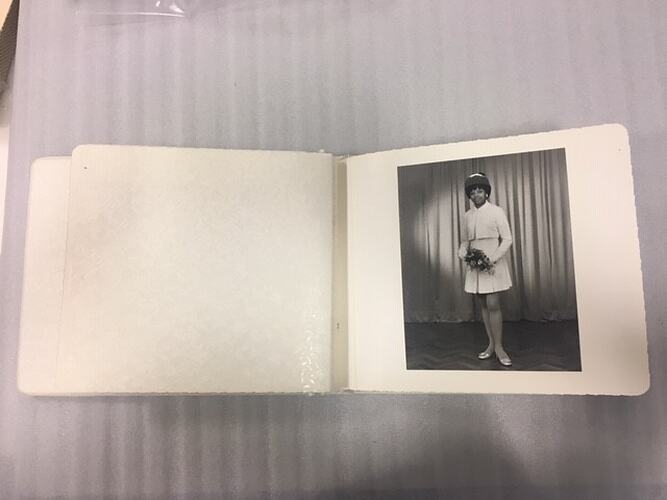 Full-length black and white photograph of Sylvia Motherwell on her wedding day in London on 29 September 1969. She is wearing a 1960s-style mini dress and cropped jacket, with a hat and low-heeled satin pumps. She has a small bouquet. This is one of 11 photos in their wedding album.