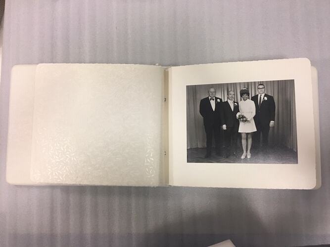 Black and white photograph of Sylvia and Lindsay Motherwell with their two groomsmen at their wedding in London on 29 September 1969. This is one of 11 photos in their wedding album.
