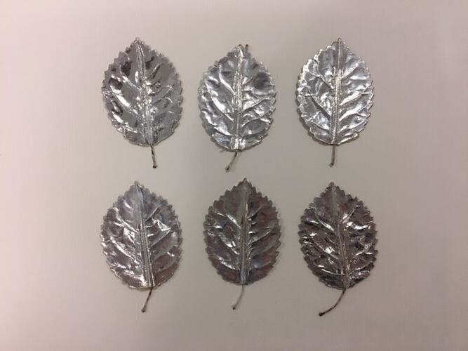 A silver leaf which was used as a wedding cake decoration at the wedding of Sylvia and Lindsay Motherwell in London on 29 Sep 1969. One of a collection of silver horseshoes, leaves and twigs all used a wedding cake decorations and stored in the couple's official wedding album.