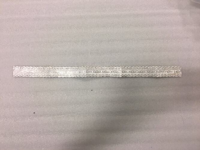 A silver foil ribbon which was a wedding cake decoration at the wedding of Sylvia and Lindsay Motherwell in London on 29 Sep 1969. One of a collection of silver horseshoes, leaves and twigs all used a wedding cake decorations and stored in the couple's official wedding album.