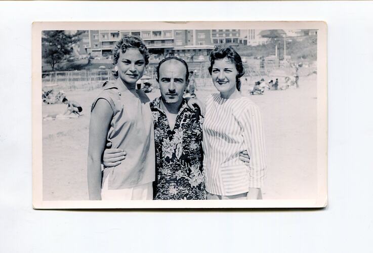 Black and white photograph of Lindsay Motherwell with his arm around two women, 1958. He is wearing his band shirt which features in photograph MM 151128. Lindsay travelled in Rhodesia and South Africa playing music for most of the 1950s and 1964-69.