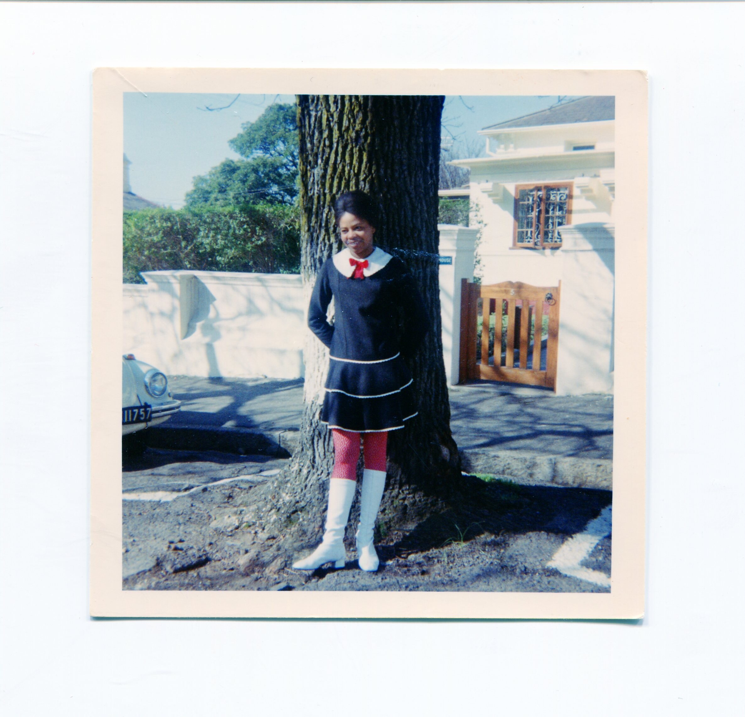 Young woman standing in front of a tree on a residential street, wearing a 1960s-style mini dress, black with long sleeves and a wide collar tied with a red ribbon. Paired it with red geometric patterned tights and white go-go boots.