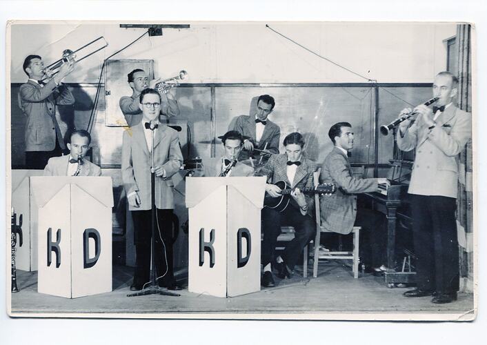 Nine men playing together in a band, from left to right: trombone, saxophone, trumpet, singer, saxophone, drums, guitar, piano, clarinet. All wearing bow ties but their jackets do not match. Initials "KD" appear on the music stands.