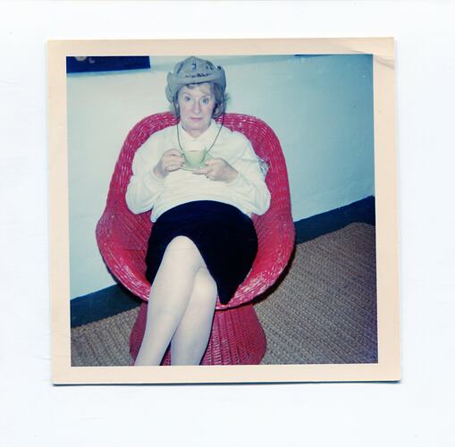 Woman wearing a battered hat and sitting in a red wicker chair drinking a cup of tea.
