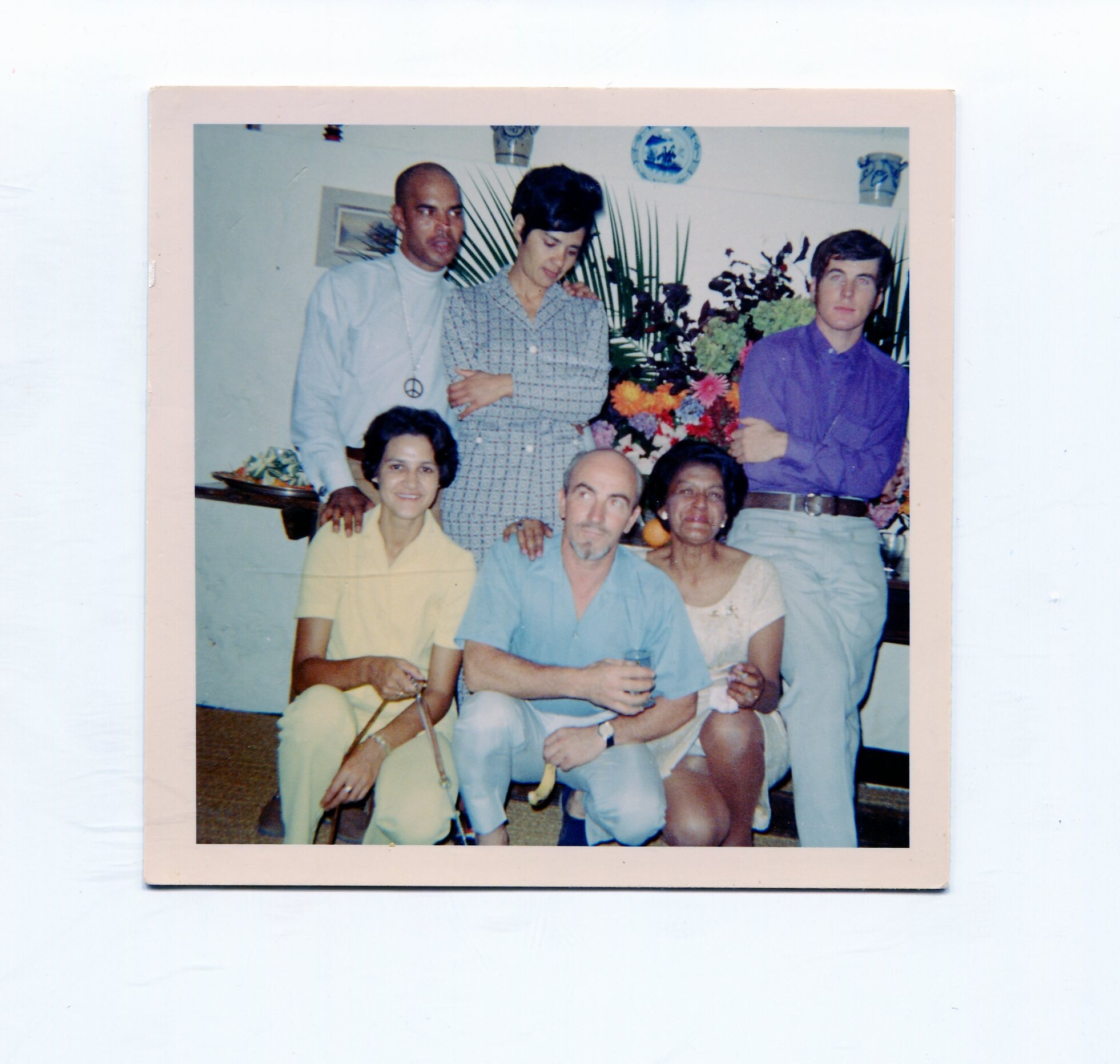 Colour photograph of Lindsay Motherwell with a group of friends at a party in Cape Town, South Africa, 1960s. This was taken during the apartheid era, but this party is mixed (both black and white people attended), which would have made it unusual at the time.