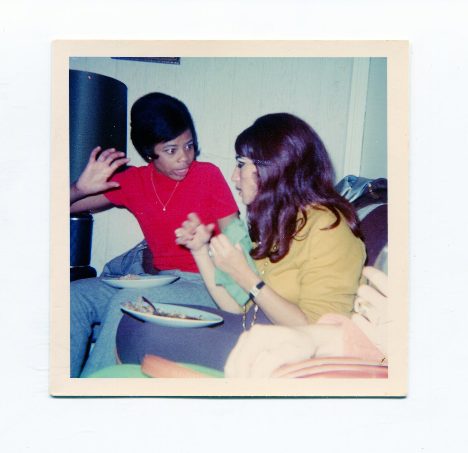Two women seated next to each other on a couch, with plates of food on their knees. Both are talking animatedly and using their hands.