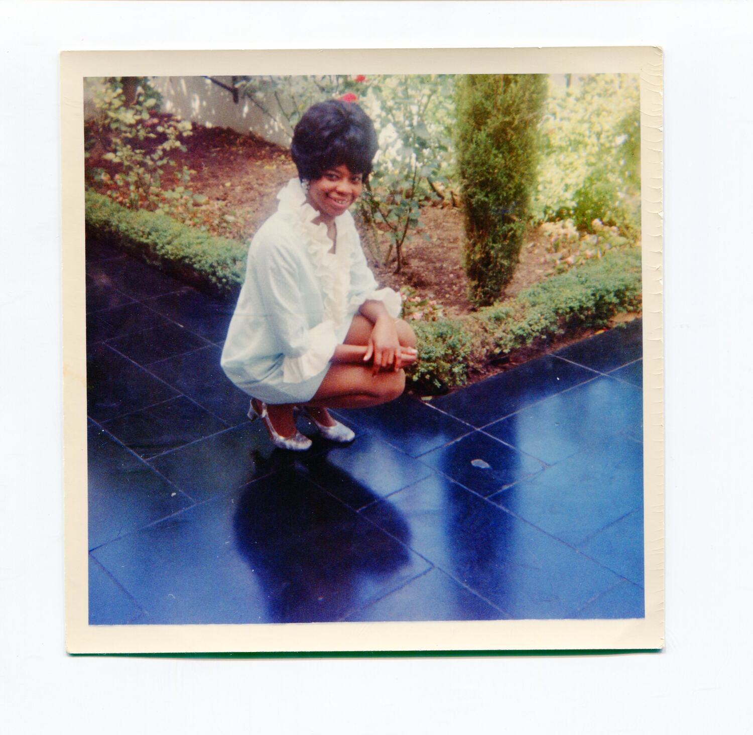 Colour photograph of Sylvia Boyes posing in a light blue mini dress with white ruffles in Cape Town, South Africa, late 1960s. Sylvia always loved fashion, and attended parties with Lindsay before they escaped apartheid to get married and move to Australia.