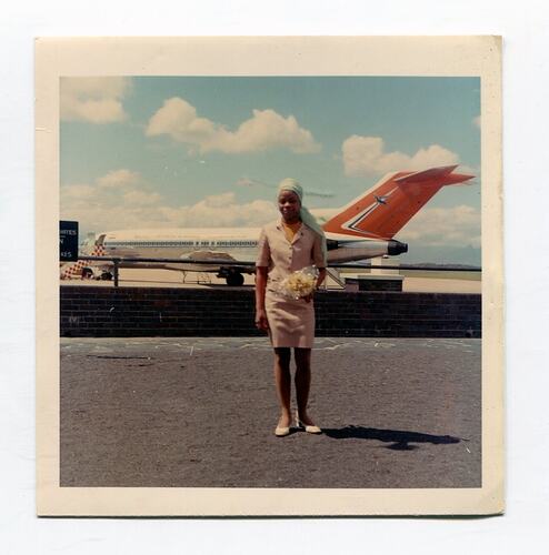 Colour photograph of Sylvia Boyes standing in front of an aeroplane before she departed South Africa, 1969. Sylvia was following Lindsay Motherwell to London so they could get married.