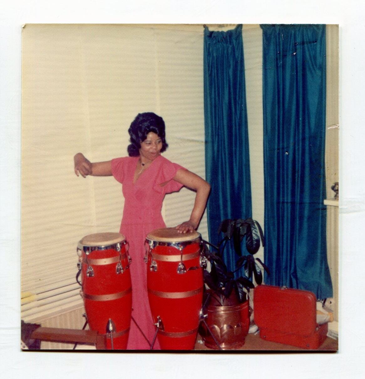 Woman playing two red hip-height bongo drums. She is wearing a hot pink maxi dress with ruffled sleeves. One hand is striking a bongo, and the other is in the air in a performative pose.