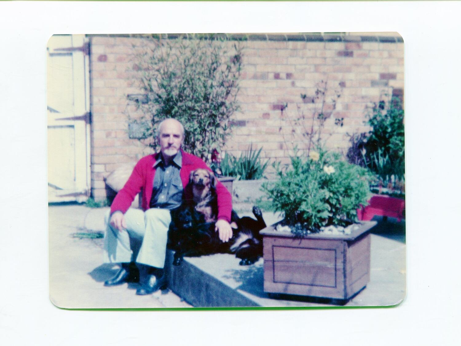 Colour photograph of Lindsay Motherwell sitting on a step in his backyard, with his arm around two dogs, 1970s. There are a variety of pot plants around him. Lindsay and his wife Sylvia lived in Melbourne for most of their lives.