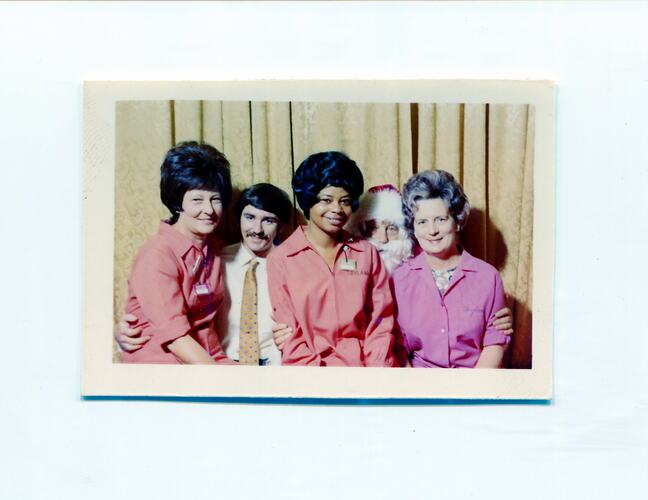 Colour photograph of Sylvia Motherwell with three co-workers and Santa Claus, 1970s. Sylvia (centre) and the two other women are sitting on the knees of Santa Claus and a male co-worker. Sylvia worked at Toyland in Myer Department Store for several years while living in Melbourne.