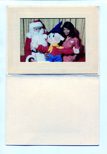 Colour photograph of Sylvia Motherwell wearing a 'Toyland' jumpsuit with Santa Calus and a large soft toy, 1970s. Sylvia worked at Toyland in Myer Department Store for several years while living in Melbourne.