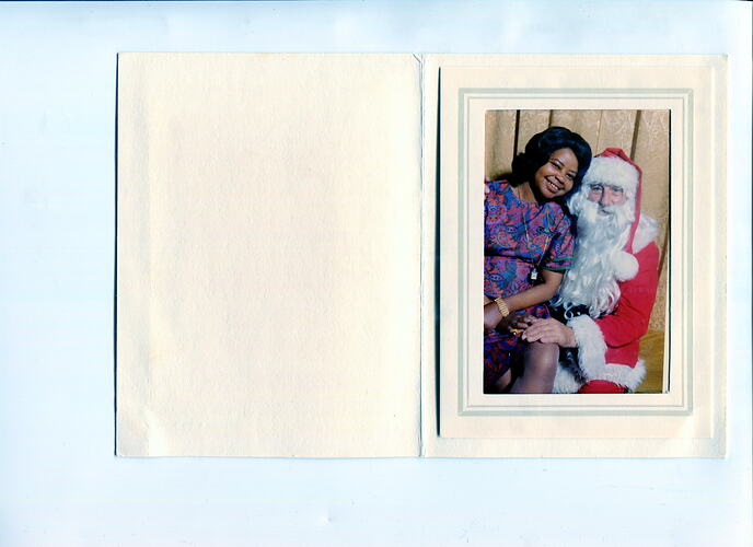 Colour photograph of Sylvia Motherwell sitting on Santa Claus's knee, 1970s. She is wearing a floral dress with a name badge pinned to it. Sylvia worked at Toyland in Myer Department Store for several years while living in Melbourne.