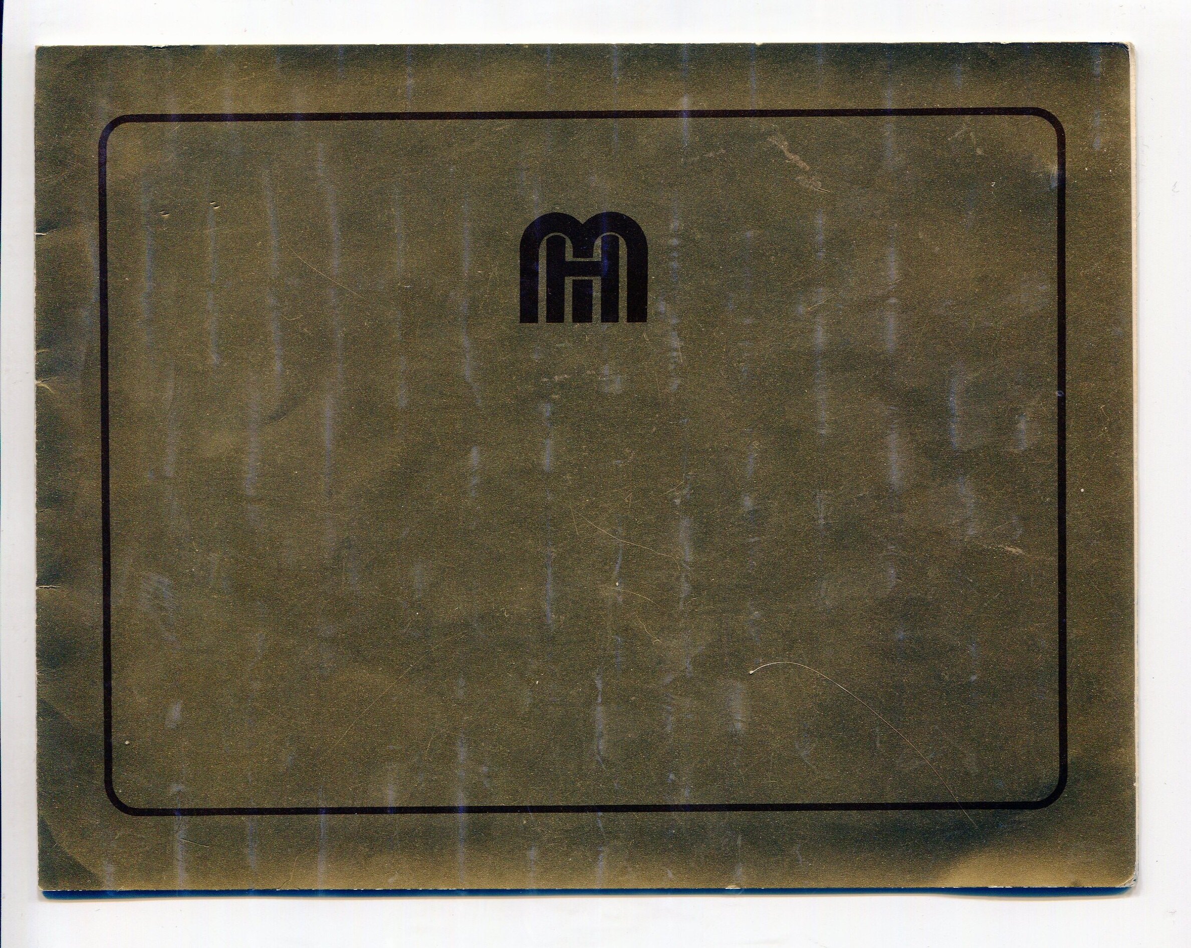 Black and white photograph inside a gold card which has the Melbourne Hilton logo on the front. Opposite the photo is an illustration of a building with the details of the hotel. On the back are the details of the photographer.