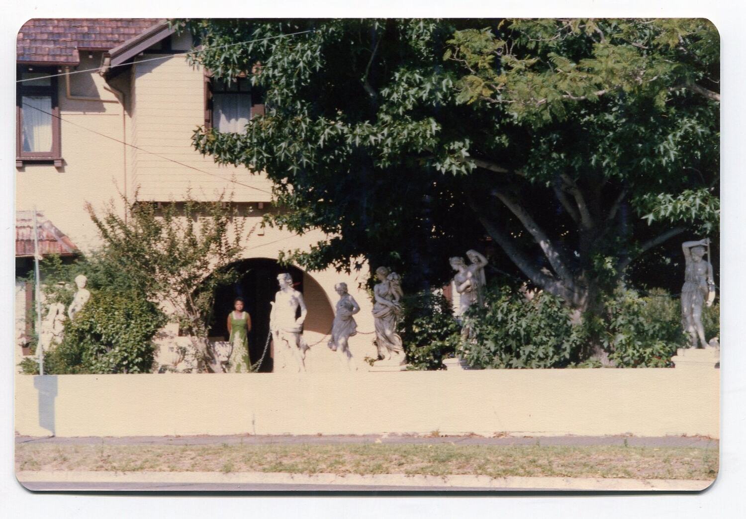 Woman standing under the porch of a house, photo is taken from across the road. There is a low white-washed wall, several white Grecian/Roman statues and a large tree in the front yard.
