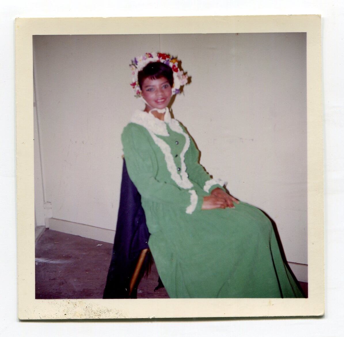 Colour photograph of Sylvia Boyes wearing a theatre costume which consists of a full-length green dress and a floral cap. Sylvia was involved in the Eoan Group theatre company during the 1960s.