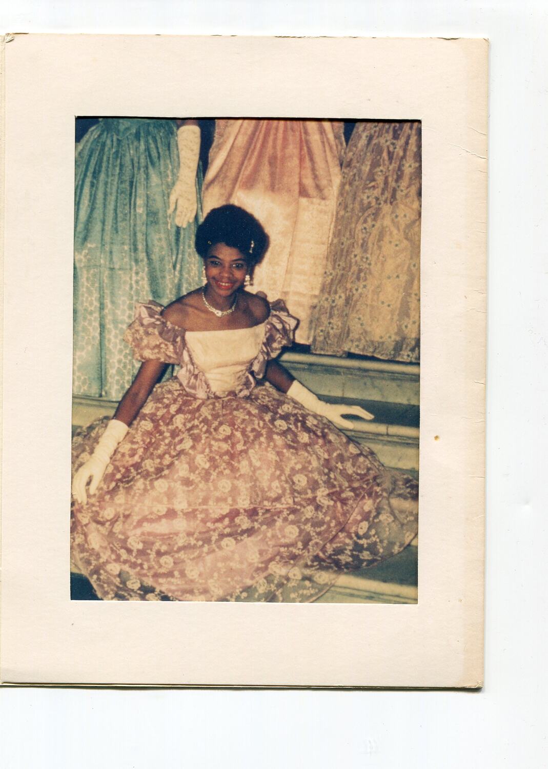 Colour photograph of Sylvia Boyes wearing a theatre costume housed in a folded card. It consists of a purple ball gown and silver jewellry. Sylvia was involved in the Eoan Group theatre company during the 1960s.