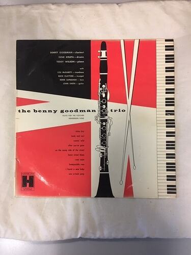 A 12" record in its original plastic sleeve within a cardboard album cover. The front cover is a red, black and white geometric patter with an image of piano keys running down the right hand side, a clarinet in the centre and two drum sticks between the two. The title "the benny goodman trio" is written in the centre, split by the clarinet. Beneath that is a by-line "PLAYS FOR THE FLETCHER HENDERSON FUND". Above that is a list of musicians and their instruments who feature. Beneath the title is a list of songs on the record. The back of the cover has a white background, and the top half is text, details of songs on each side, a blurb above the Benny Goodman Trio and a blurb about Harmony Records. The bottom half of the back are a series of images of other Harmony Records record covers.