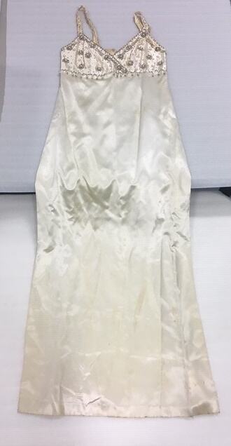 White satin, full-length gown with a beaded cross-over bodice and thin straps. There are two slits up the sides of the dress.