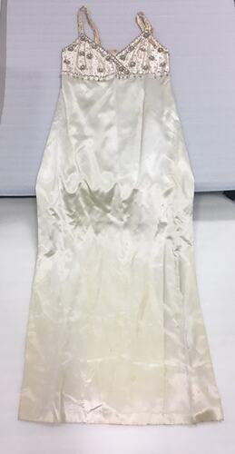 A white satin full-length gown which Sylvia Motherwell can be seen wearing in the following photographs in the collection: