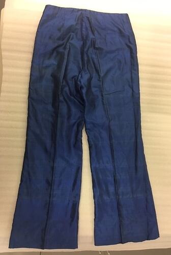 Pair of wide-legged blue silk pants, no label. It has a matching blue and gold shirt, HT56449. Sylvia Motherwell loved fashion throughout her life, and had many beautiful clothes.