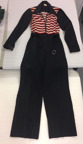Full-length, long-sleeved black jumpsuit, with a terry-towelling chest panel which is striped red, white and black. The brand is 'Hi Jack'. It was owned by Sylvia Motherwell. Sylvia loved fashion throughout her life, and had many beautiful clothes.