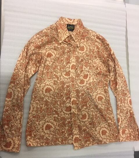 Cotton Gloweave body shirt with an orangle paisley print, owned by Lindsay Motherwell. Lindsay was quite a fashionable dresser and worked in a menswear store briefly.