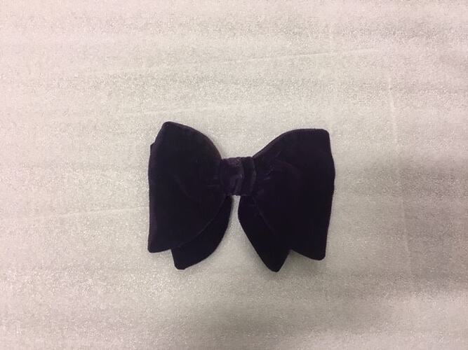 Purple velvet clip-on bowtie, owned by Lindsay Motherwell. Lindsay was quite a fashionable dresser and worked in a menswear store briefly.