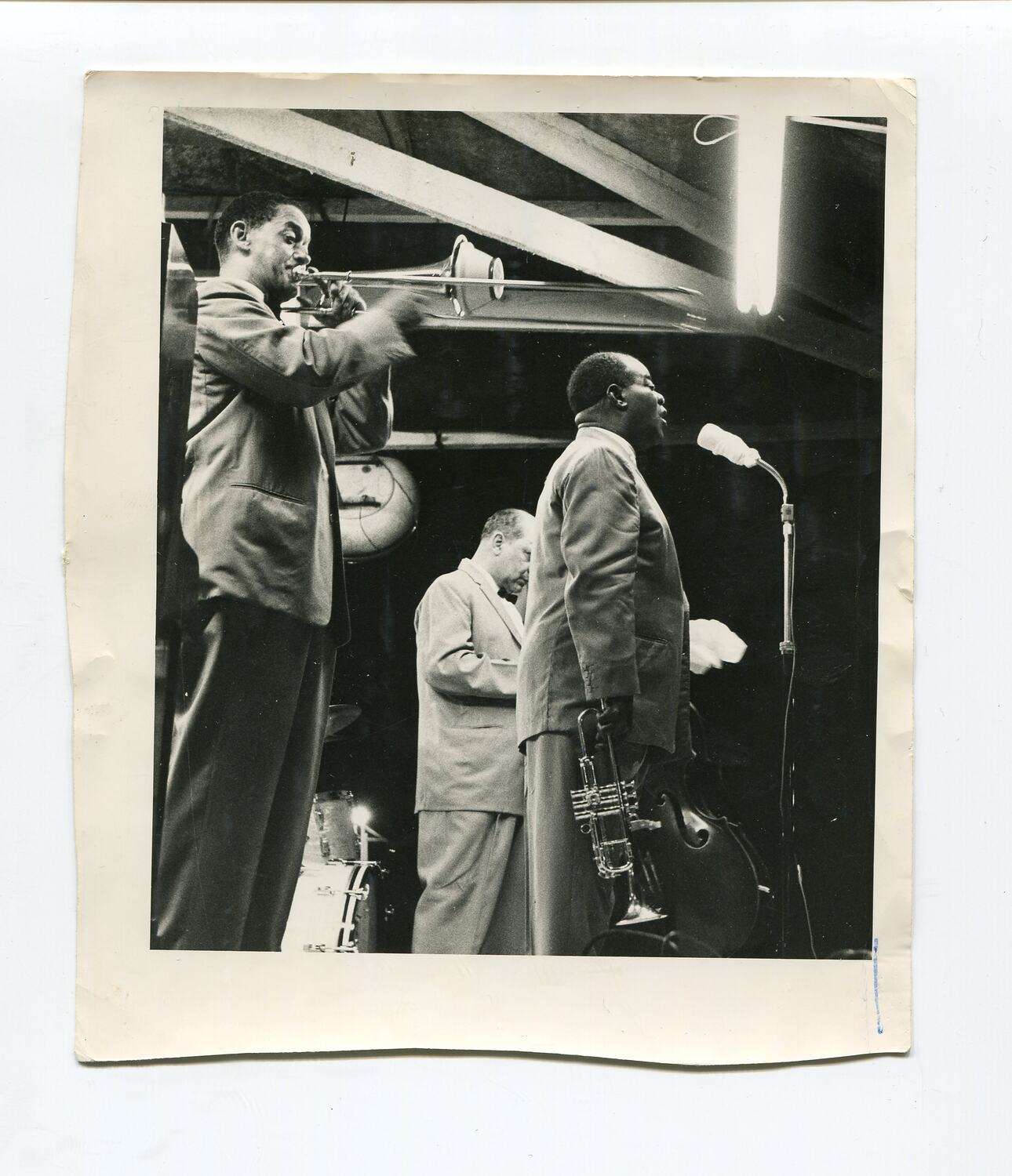 Black and white photograph of Americal jaz performer Louis Armstrong performing, circa 1950s. Armstrong toured Africa in 1956 and 1960-61. In this later tour, he travelled to Rhodesia, where Lindsay Motherwell might have seen him play or taken this photograph. Lindsay travelled in Africa between 1951 and 1961, and again from 1965 to 1969. He was a musician and a jazz fan, so he would have loved to see Louis in Africa.