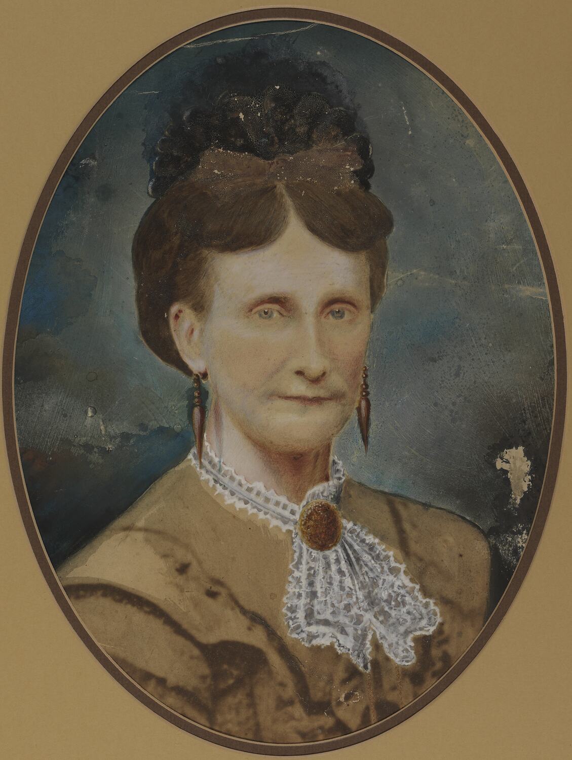 Digital photograph of a hand-coloured photographic portrait of Maria Langridge, first wife of George David Langridge. The photograph has been taken from the original framed portrait.