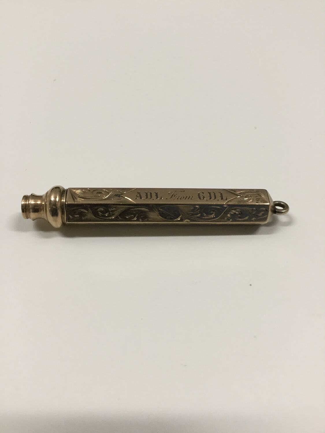 Retractable gold engraved pencil in original box It is engraved 'ADL from GDL' - Arthur David Langridge from George David Langridge. The pencil was a 21st birthday gift from George Langridge to his son Arthur and purchased at 23 Bourke Street Melbourne in 1879. The pencil was then passed on to Jeannie Langridge Arthur's daughter and then by her to her son Ron McKenzie (the donor) in 1946.