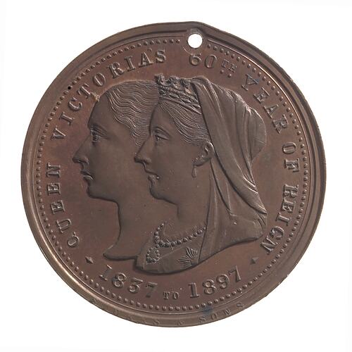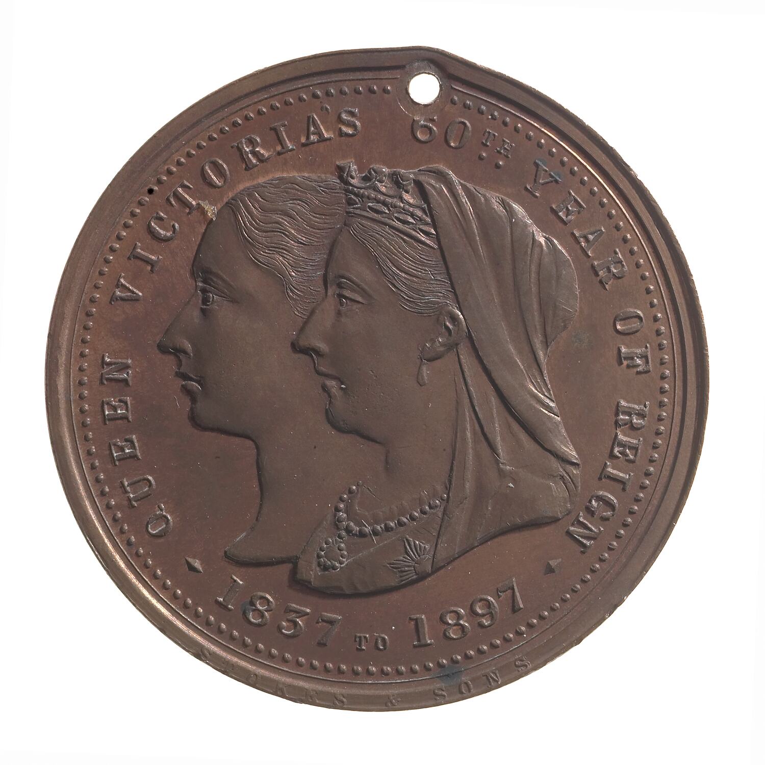 Jugate busts, young & old Queen Victoria; around, QUEEN VICTORIA'S 60TH YEAR OF REIGN * 1837 TO 1897 * (stops on either side of date in form of diamonds); mint name, STOKES & SONS, in tiny letters on rim below dates