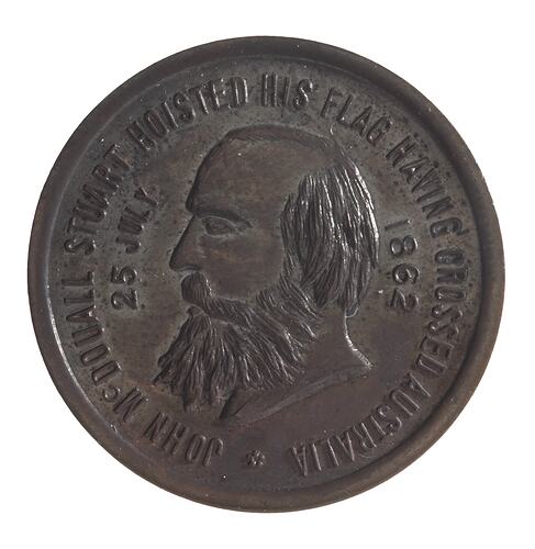 Other Details: Bronze strike of medal awarded (in gold) to members of the John McDouall Stuart expedition to cross Australia in 1862 on the occasion of the Jubilee of the expedition in 1912. Stuart was a Scottish immigrant who had trained at the Scottish Naval and Military Academy. He joined a surveying party soon after his arrival in Australia in 1839, and was invited to join his first exploring party by Charles Sturt. He became a seasoned surveyer and explorer. At the end of 1860 the South Australian government hastily granted money to fund his journey across Australia, hoping to beat Burke and Wills, who had already left. Between January and September 1861 he attempted an exhausting journey that ultimately failed, but unlike Burke and Wills he returned to Adelaide alive. Undaunted, he set off again the following month, in late October 1861. The party reached the centre of Australia on 12 March 1862, and on 24 July 1862, suffering for exhaustion, they forced their way through thick scrub and came upon the Indian Ocean. On the return journey Stuart became ill with scurvey and nearly blind, and many horses became so weak they had to be abandoned. The party arrived in Adelaide on 17 December. A public holiday was called for 21 January, and a parade rode through the streets. Stuart was still exhausted, nearly blind and white-haired, and died four years later, aged 51.
