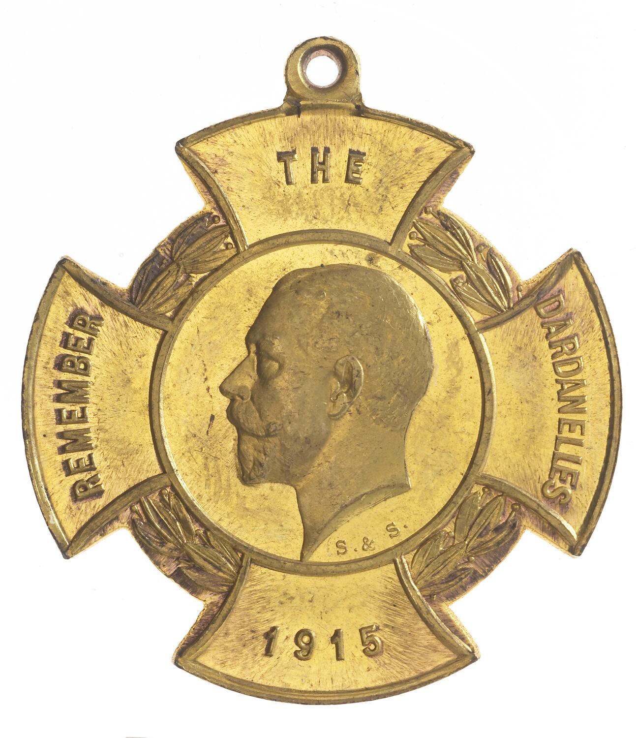 At centre bare head of George V left; below in tiny letters, S&S; on arms of cross, REMEMBER THE DARDANELLES 1915