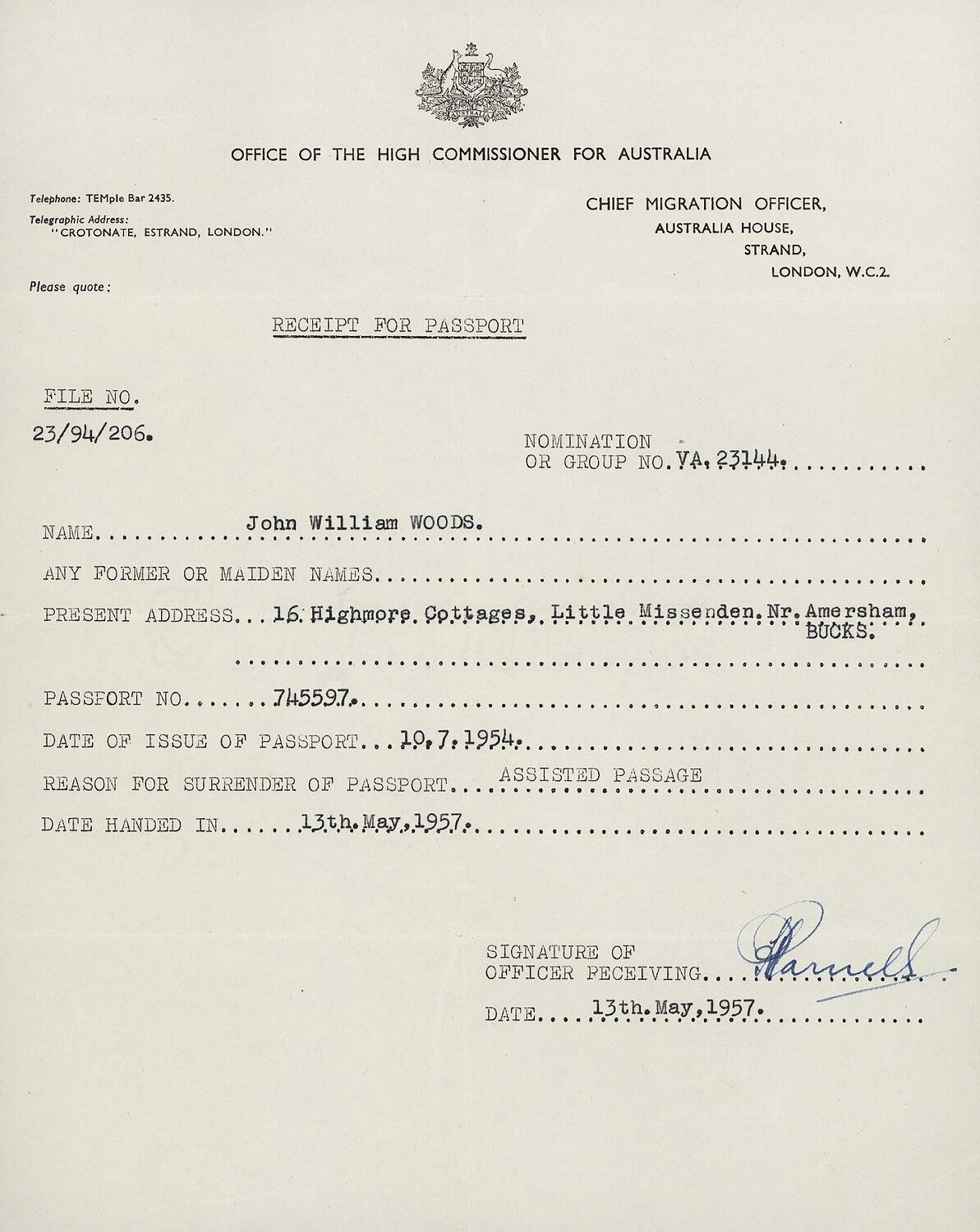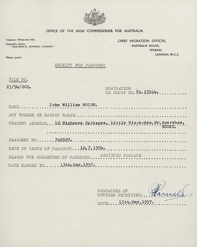 Receipt issued by the Chief Migration Officer, Australia House, London, to John William Woods for surrender of his passport to the Chief Migration Officer. Assisted migrants to Australia were required to surrender their passport to the Australian Government for two years, and issued with a replacement identity document, until they had completed two years residency in Australia.