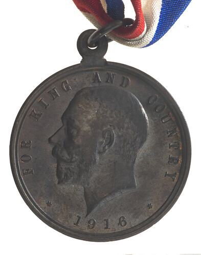 Head of George V facing left, mint initials on truncation, S&S; around above, FOR KING AND COUNTRY below, * 1916 *