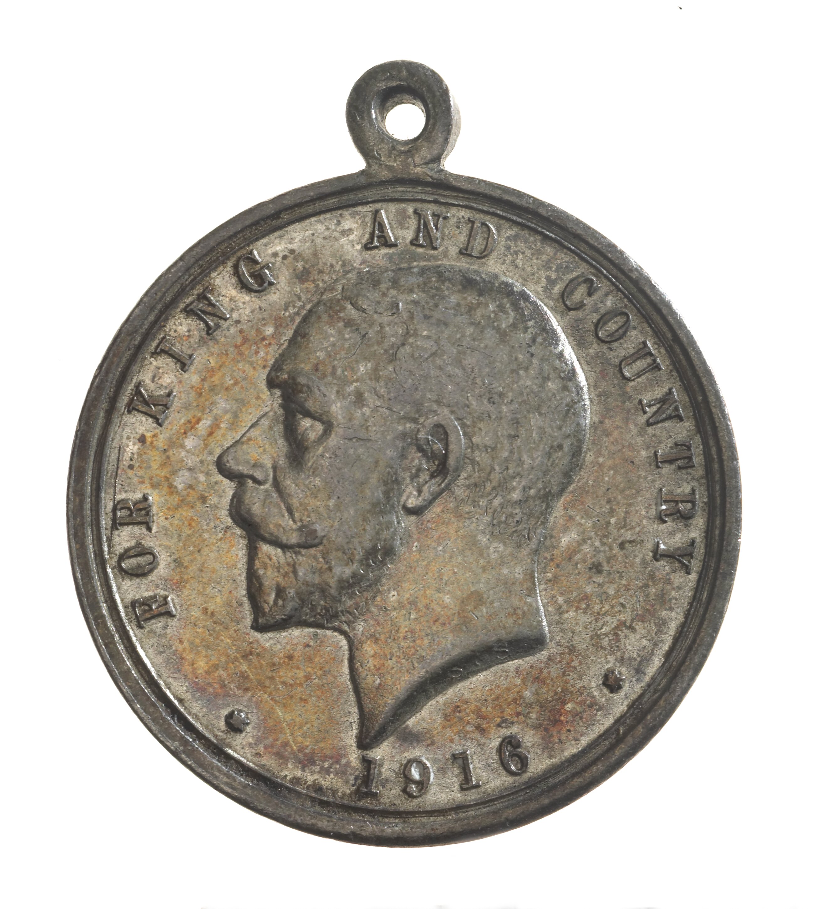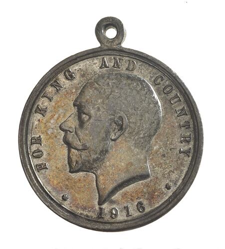 Head of George V facing left, mint initials on truncation, S&S; around above, FOR KING AND COUNTRY below, * 1916 *