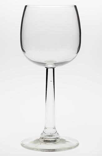 The wineglass is of the traditional shape, i.e. long- stemmed, flaring out to the base and topped by a rounded, bulbous body. It is of clear, white glass.