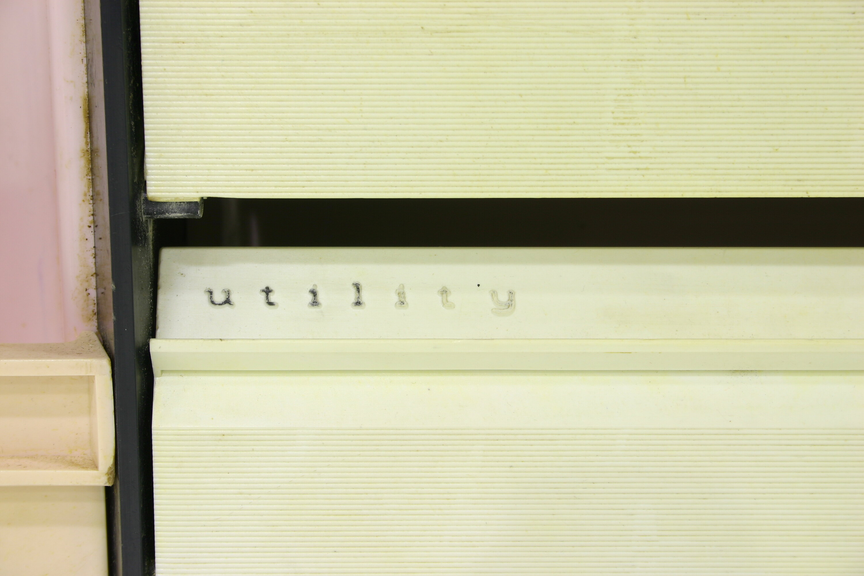FRONT: across metal band crown logo applied in gilt, incised "FRIGIDAIRE made only by general motors De Luxe". BACK: metal disk applied to compression unit "pat. no. 394457/ charge 17 oz/ serial no. 90867". A meter miser tag applied to the compressor. Two paper labels, one above the other, upper centre. The top one an illustration of the mechanics. The bottom one a list of General Motors - Holden patents "103,609 134,900 200,459/ 104,863 135,552 1463/54 (APPLN.)/ 105,301 137,350 139,091/ 105,790 141,947 152,3031/ 105,811 164,501 163,507/ 107,211 166,329 159,369". Sticker applied upper right, gilt lettering on clear background "made in Australia by General Motors - Holden's Limited". 2 paper florettes middle right, one above the other identifying the product has passed GM inspection. Metal tag screwed to the compression unit "D112 90867". INTERIOR: around temperature dial "3 2 1 A B C DEFROST (downward arrow) OFF (downward arrow)". On handle of cream drawer "meat tender". On handle of pink drawer "hydrator". FREEZER COMPARTMENT - under handle on door "FRIGIDAIRE (applied crown logo) freezer chest". Inside the freezer door "DO NOT USE SHARP OBJECTS TO REMOVE FROST" above crown logo. Moulded on handle of ice trays "FRIGIDAIRE" and on lever of inserts "QUICKUBE PAT'D". DOOR - compartment doors from top to bottom, moulded upper left "cheese", "eggs", "eggs", "utility", "utility".