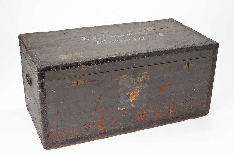 Zinc lined travelling trunk first owned by someone by the name of Cummings, inscribed on top of the lip, and was probably used in the 1880s by somebody migrating to Australia. It was subsequently acquired by Thomas Darragh in Melbourne for a trip.