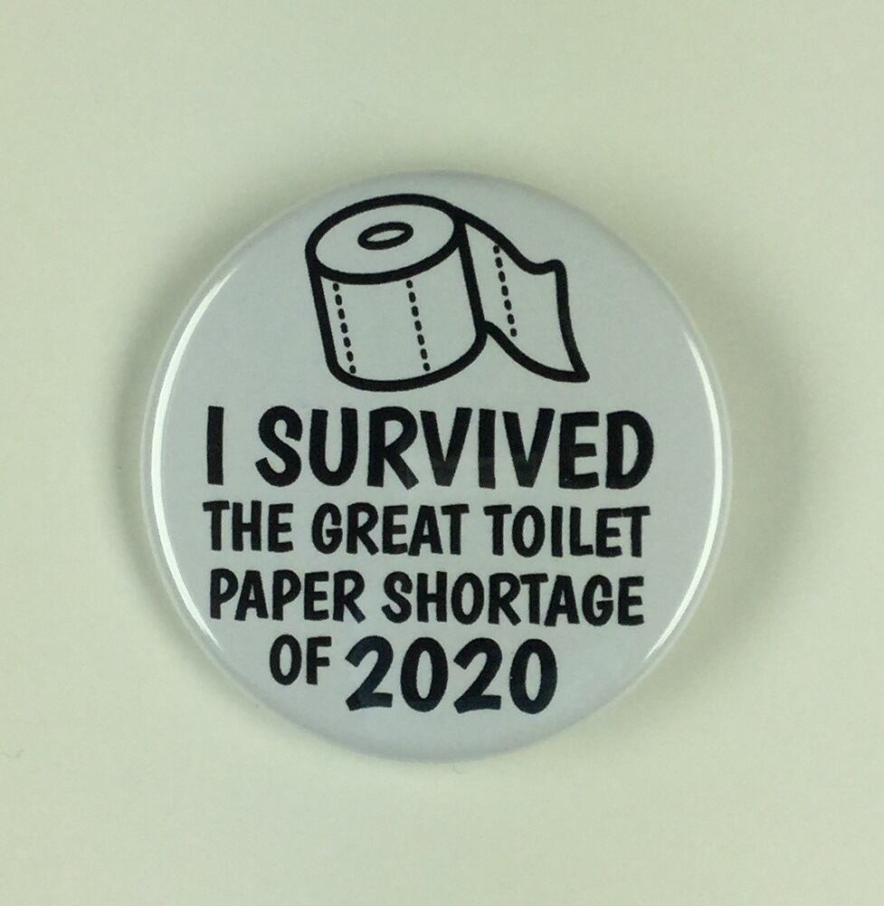 Round metal badge with outline of a roll of toilet paper on the front and the words 'I SURVIVED THE GREAT TOILET PAPER SHORTAGE OF 2020' below. Both are in black on a white background.